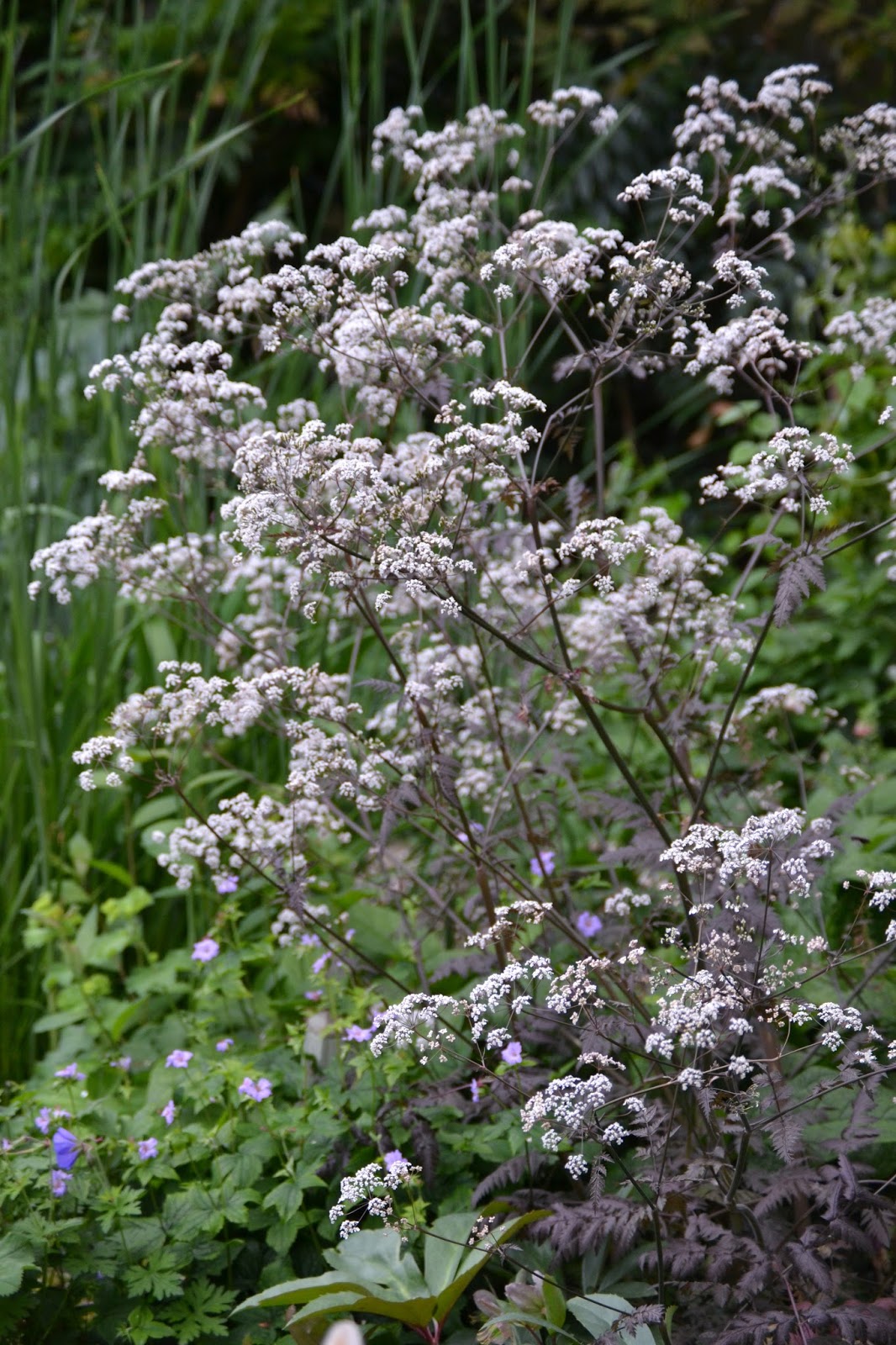 The final contender today is Anthricus sylvestris ‘Ravenswing’, a purple stemmed and less prolific cousin of the wild cow parsley. I bought this at the annual garden opening at Alltyrodyn Mansion in Wales two years ago – it’s now 5′ by 3′ and sits at the edge of the pond – a fine specimen!