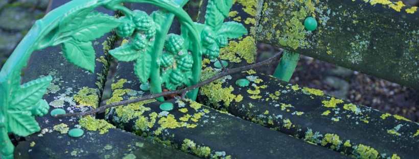 On a bench encircling a tree in Walsall Arboretum, there are at least 3 different lichens in this colourful patchwork, the yellow Xanthoria parietina and two I can’t identify.