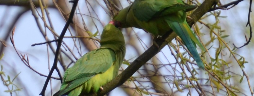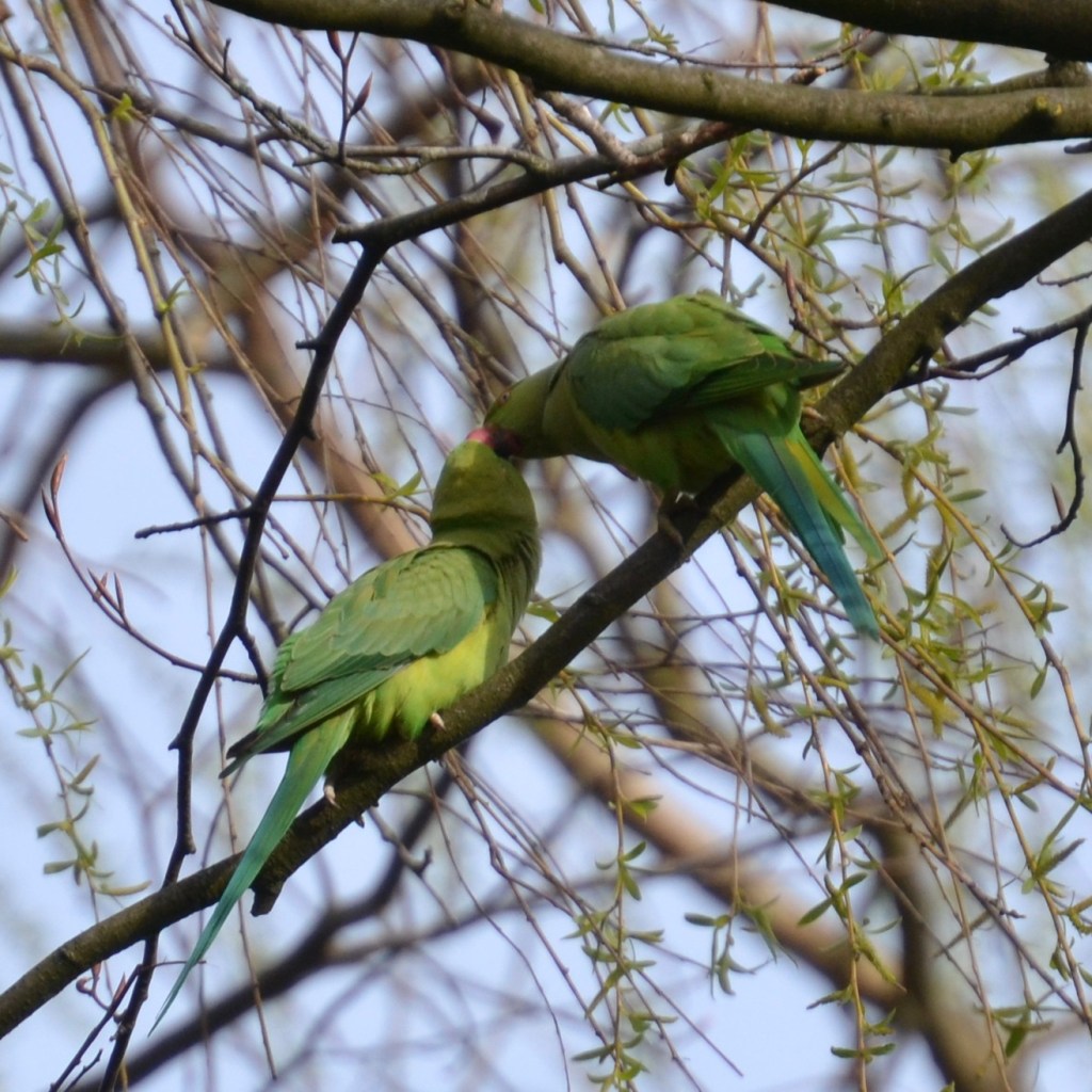 I photographed these kissing parakeets, perhaps in trothplight, hogging the limelight in Walsall Arboretum last Spring! They’re easy to identify even before you see them as they have a very distinctive call, very different to our native birds, particularly in flight….
