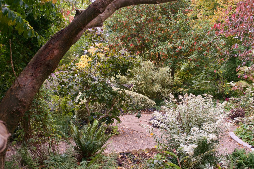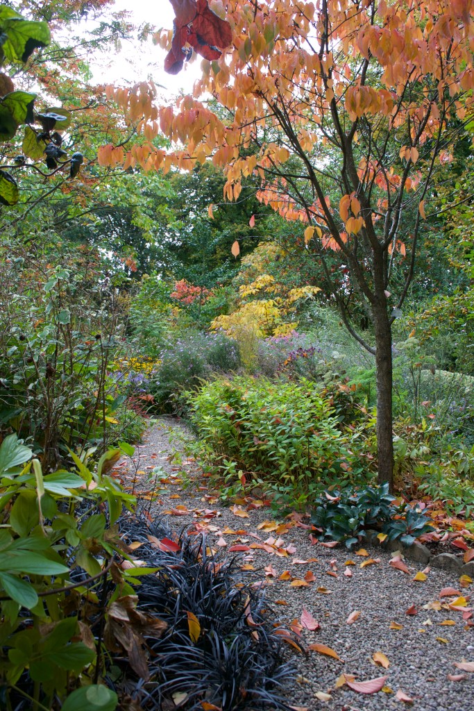 Unexpectedly, a woodland walk emerges on the garden perimeter, but not surprisingly the leaves of the trees and shrubs filling the landscape are every shade of the autumn colour spectrum.