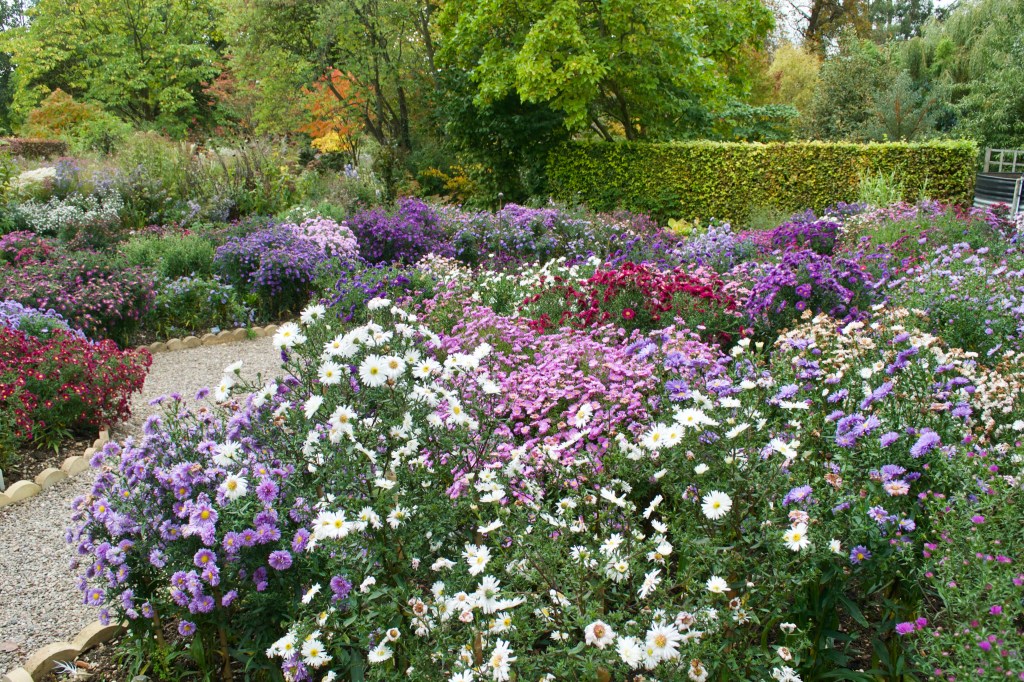 Onto the garden’s centrepiece – a patchwork quilt of autumn flowering asters – a showcase for the wide range of colour of these delightful daisies, mainly pastel but with the occasional ruby jewel.